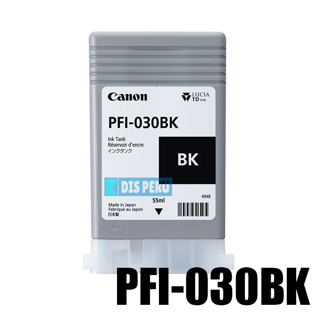 La tinta Canon PFI-030 BK de 55 ml, color negro pigmentado, es un consumible original diseñado para las impresoras Canon imagePROGRAF TM-240 y TM-340. Asegura líneas nítidas, excelente contraste y durabilidad superior. Encuentra este producto 100% original en DISPERU.pe.