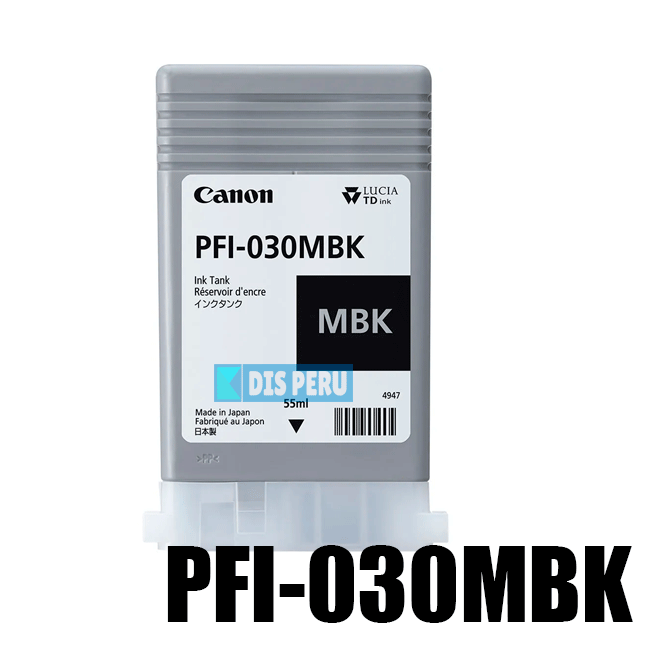 Tinta Canon PFI-030MBK Negra Mate (Matte Black), original y pigmentada, en presentación de 55 ml. Diseñada especialmente para impresoras Canon imagePROGRAF TM-240 y TM-340. Garantiza precisión, durabilidad y resultados profesionales. Disponible en DISPERU.pe.